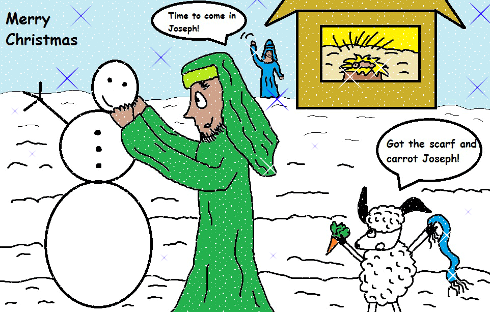 Christmas Nativity/ Joseph building A Snowman, Mary Calling, And Baby Jesus Laying In Manger Glitter Graphics