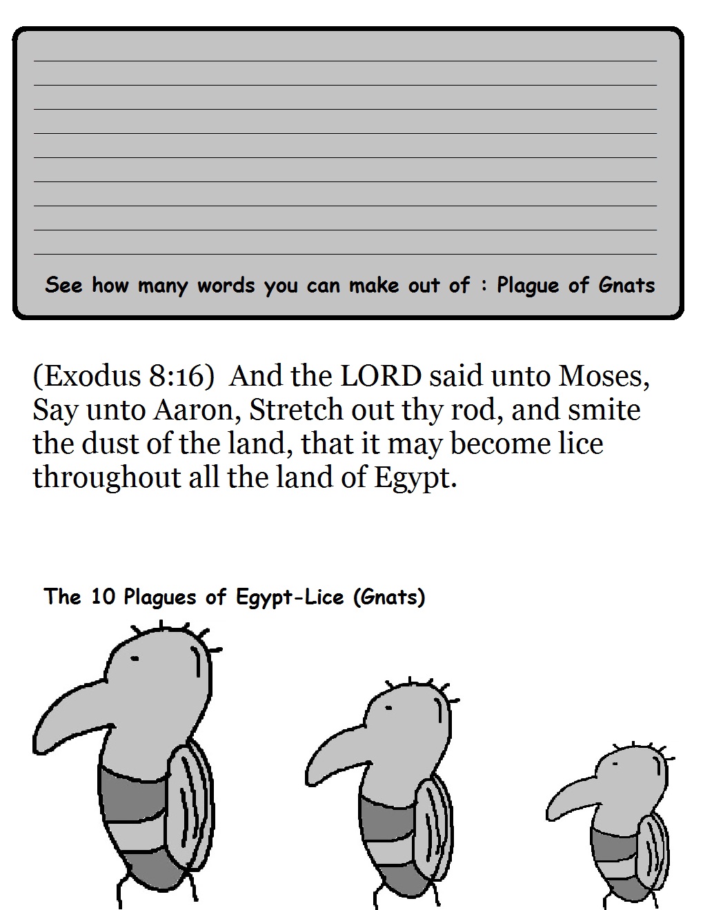 Print out and laminate. Hold this up to the kids when teaching on the plague of lice.