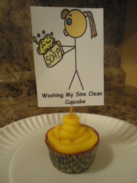 Bake your cupcakes. Smear your frosting on. We used yellow frosting. We bought it like this. It was a Yellow Dandelion Crayola Frosting. We just swirled it around to get the circle effect. Print the template and cut it out. Tape to toothpick and stick in cupcake. Take to childrens church or Sunday school class for the kids to eat.